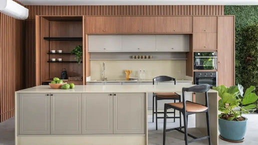 Para que o resultado seja equilibrado, é essencial que o revestimento dialogue com os móveis planejados, considerando cores, texturas e volumes. Aplicações pontuais funcionam melhor, especialmente em dormitórios onde o descanso é prioridade, evitando excessos que podem tornar o ambiente visualmente carregado.
